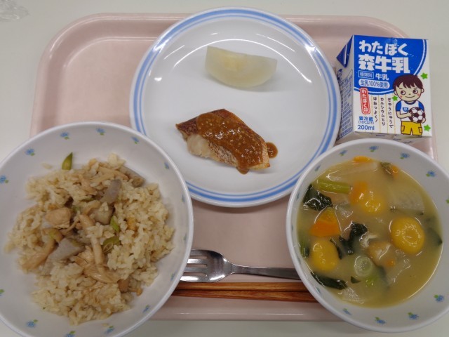 ・里芋ごはん ・魚のごまみそ焼き ・お月見白玉汁 ・くだもの(梨) ・牛乳