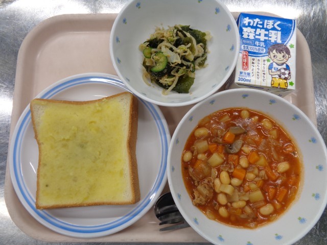 ・スイートポテトトースト ・じゃこ入り海藻サラダ ・ポークビーンズ ・牛乳