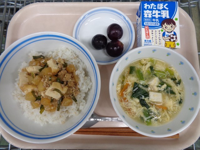 ・大根のピリ辛煮込み丼 ・かきたま汁 ・くだもの(巨峰) ・牛乳