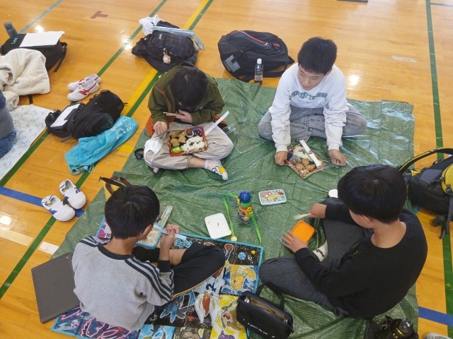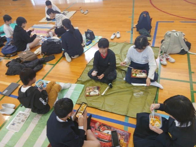 お昼の時間です。交流グループごとに体育館でお弁当を食べました。