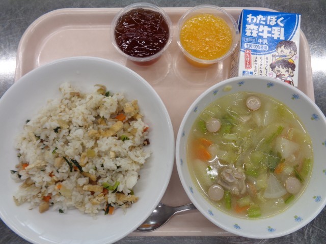 ・じゃこべぇピラフ ・ABCスープ ・【セレクト給食】紅茶ゼリーorつぶつぶみかんゼリー ・牛乳