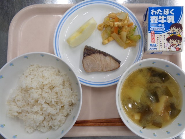 ・ごはん ・ぶりの塩焼き ・油揚げと醤油の和え物 ・わかめとじゃがいものみそ汁 ・くだもの(りんご) ・牛乳