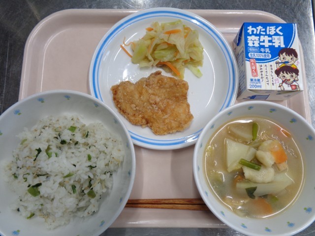 ・ごはん ・山賊焼き ・キャベツ炒め ・ひんのべ汁 ・牛乳