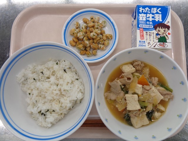 ・わかめごはん ・肉豆腐 ・のり塩大豆 ・牛乳