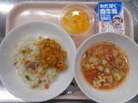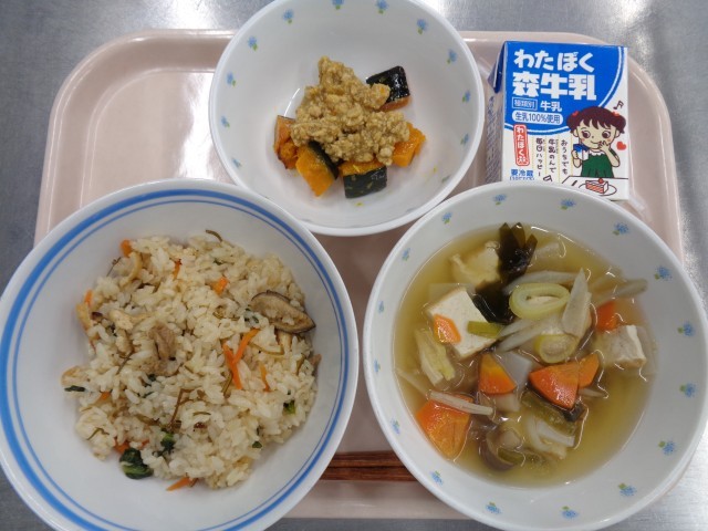 ・こんぶごはん ・冬至かぼちゃのそぼろあんかけ ・ゆず風味けんちん汁 ・牛乳