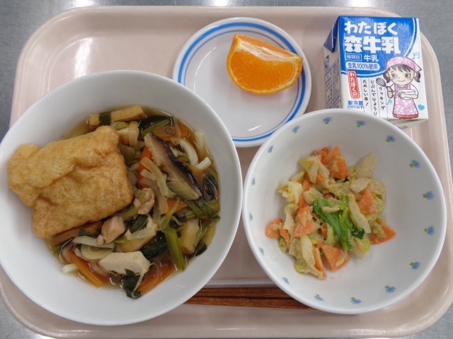 ・力うどん ・野菜のごまみそ和え ・くだもの(ぽんかん) ・牛乳