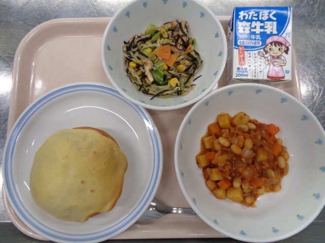 ・ビスキュイパン ・チリコンカン ・バランスサラダ ・牛乳