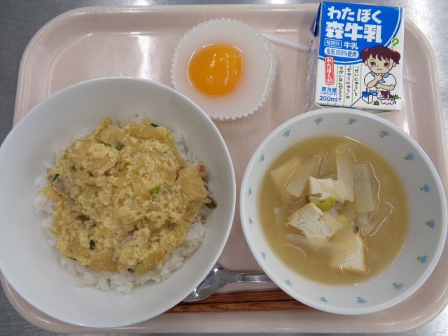 ・あぶたま丼 ・大根のみそ汁 ・おかしな目玉焼き ・牛乳