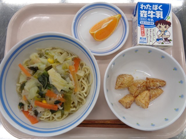 ・野菜たっぷり塩ラーメン ・ポテトのチーズ揚げ ・くだもの(デコポン) ・牛乳