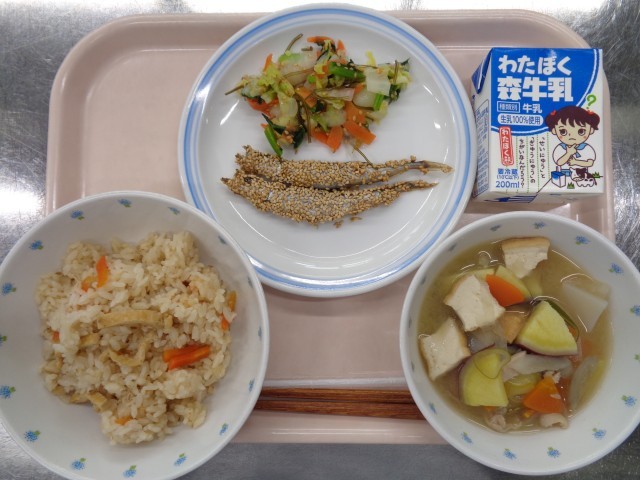 ・こぎつねごはん ・ししゃものごま焼き ・白菜の松前和え ・さつま汁 ・牛乳