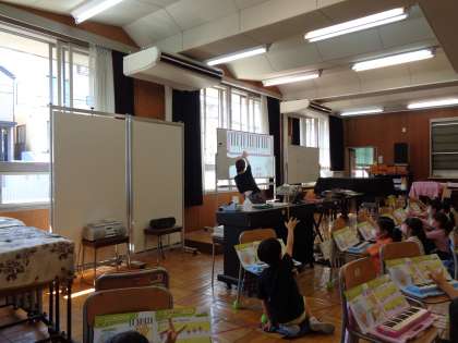 「かえるのがっしょう」を練習しています。ハミングをしながらドレミを覚えて、指だけの練習に取り組んでいます。指番号やリズムを間違えないように気を付けながら、キーボードの音に合わせて楽しく演奏しています。