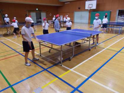 体育館で様々なスポーツに取り組んでいます。今回は、卓球でした。協力して取り組むことで準備の時間が短くなり、スポーツを楽しむ時間が増えました。楽しそうな笑顔がたくさん見られました。