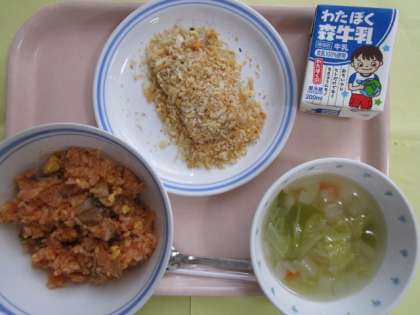 ツナと卵のケチャップライス 野菜スープ 鮭のバジルパン粉焼き 牛乳