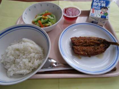 ごはん いわしのかば焼き ゆで野菜のドレッシングソースかけ 紅白ゼリー 牛乳