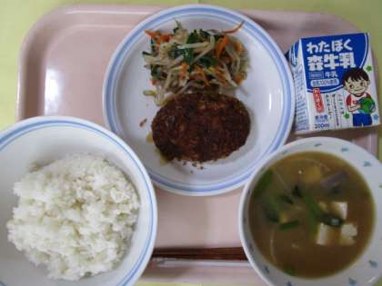 ごはん むろあじのメンチカツ もやしのピリ辛炒め 東京野菜の味噌汁 牛乳