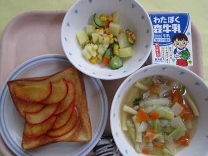 アップルトースト  パスタスープ ポテトのフレンチサラダ 牛乳