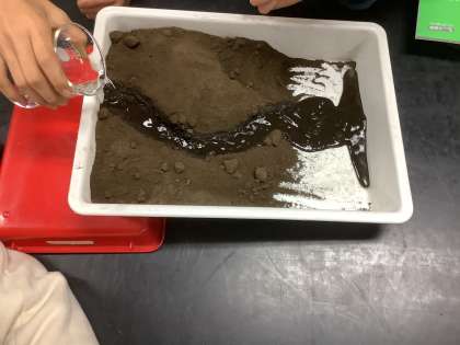 流れる水のはたらきについて実験しました。山、川、海に見立てて侵食、運搬、堆積のはたらきを理解しました。
