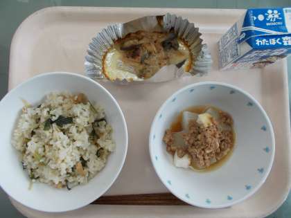 11月25日 木曜日 公開日 2021/11/25 更新日 2021/11/25 学校給食 【11月25日(木) 献立】 大根の皮の金平ごはん 魚のみそマヨネーズ焼き 大根と厚揚げのそぼろあんかけ 牛乳 <食材の産地> 大根 :東京都 たまねぎ :北海道 ピーマン :茨城県 しょうが :高知県 メルルーサ :アルゼンチン沖 豚ひき肉 :鹿児島県 いいね(0)
