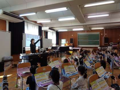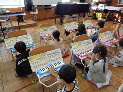 「あそぼ」と「たこたこあがれ」を練習しています。音を出して演奏する前には、指の体操をしたりドレミで歌ったりしています。正しい指番号で演奏できるように気を付けながら、リズムにのって楽しく活動しています。