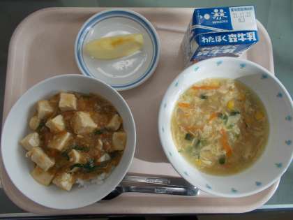 12月15日 水曜日 公開日 2021/12/15 更新日 2021/12/15 学校給食 【12月15日(水) 献立】 麻婆豆腐丼 中華風コンスープ りんご 牛乳 <食材の産地> 玉ねぎ :北海道 ニラ :高知県 にんじん :千葉県 にんにく :青森県 万能ねぎ :福岡県 長ねぎ :埼玉県 しょうが :高知県 りんご :長野県 豚肉 :岩手県 たまご :青森県 いいね(0)