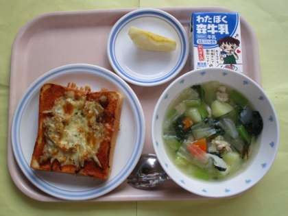 ごぼうピザトースト 鶏肉のポトフ 果物(りんご) 牛乳