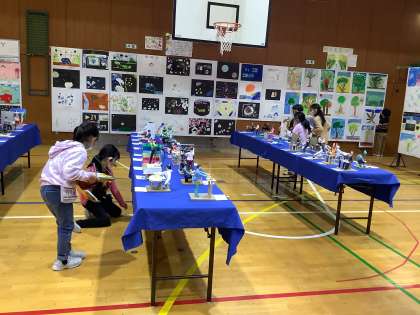 1年生にとっては、出品するのも鑑賞するのも初めての展覧会でした。他の学年の作品を見ながら「すごい」「きれい」と感動を口にしていました。鑑賞マナーをしっかりと守って、じっくりとそれぞれの作品と向き合っていました。