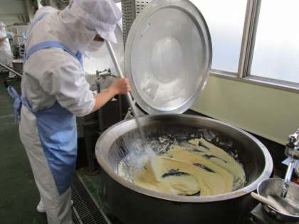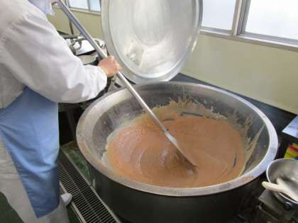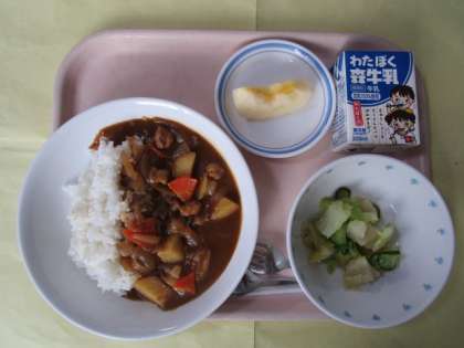 今日のメニューはカレーライスです。中根小学校のカレーはルーから手作りしており、調理師さんが朝早くから小麦粉とバターを茶色くなるまで長時間炒めています。また、時間をかけてじっくり炒めた玉ねぎや「ある果物」を入れているおかげで甘みのある仕上がりになっています。