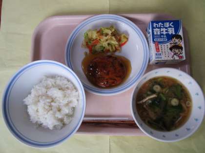 ごはん 手作りがんも 野菜の香味和え みそ汁 牛乳