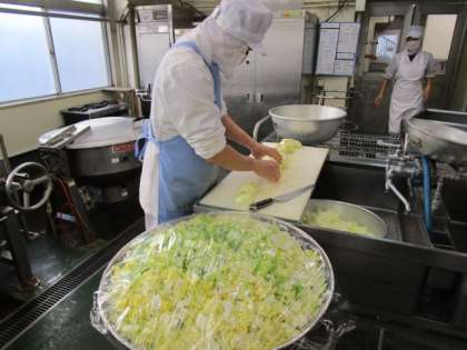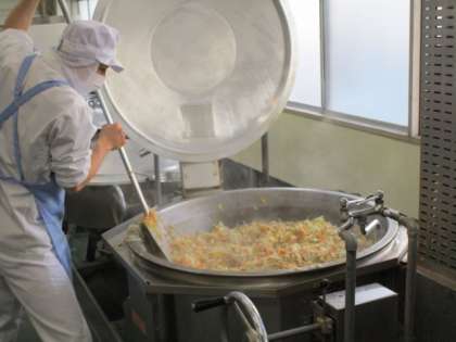 今日の献立にも豚肉やイカ、エビ、豆腐、野菜などが入っていて、調理師さんが朝早くから洗って、切って、調理をしています。苦手な食材もひと口から挑戦してみましょう。