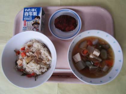全国学校給食週間4日目は埼玉県の郷土料理にしました。かてめしの「かて」には「まぜる」という意味があり、米が貴重だった時代に米に様々な具材をまぜて炊いたことが始まりです。