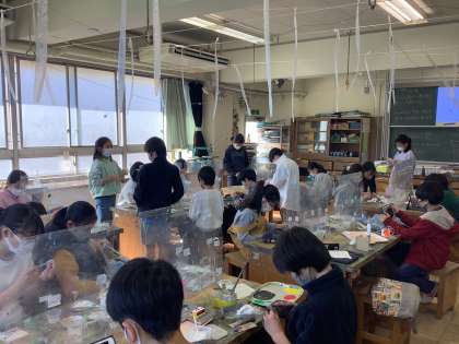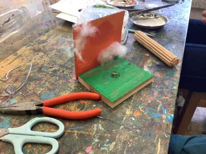 小さな人形の物語を考え、その一場面を立体で表して写真に撮ります。材料の使い方を工夫したり、どこから撮影するかを考えたりしながら制作しました。