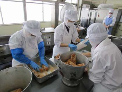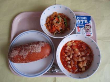 今日は6年1組のリクエスト給食です。セレクト揚げパンは人気メニュー第1位、パリパリサラダは第2位でした。そして、先月に行った揚げパンの味アンケートでは、きなこが141人、ココアが153人、シナモンが139人という結果になりました。