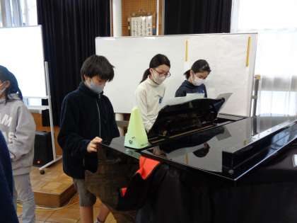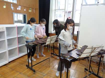 「威風堂々」の合奏の練習をしています。曲想に合った音色について考え、よりよい演奏になるよう試行錯誤しながら演奏方法を追求しています。グループごとに分かれて、互いの演奏の仕方を確かめたり、音量のバランスについて話し合ったりしながら楽しく合奏をまとめることができました。