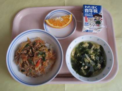豚キムチ丼 わかめスープ 果物(はっさく) 牛乳