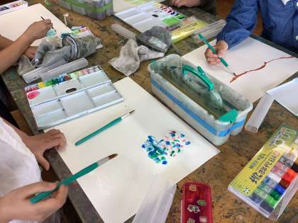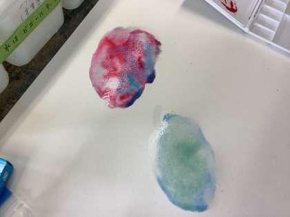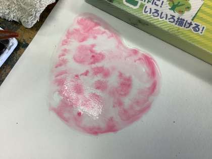 水をぬった紙の上に絵の具を落とすとふわっと絵の具が広がっていく「にじみ」、絵の具が乾かないうちに水や他の絵の具で境目をぼかす「ぼかし」。それらを学び、思いついた模様や絵を描きました。移り変わっていく絵の具の動きを楽しみながら活動していました。