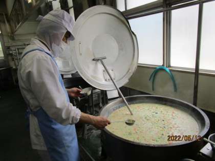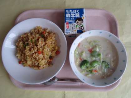 今日は給食に使用するそら豆のさやむきを1年生が手伝ってくれました。さやの様子や豆の匂いなどをよく観察しながら、頑張ってむいてくれました。むいたそら豆はクリームスープにして提供しました。