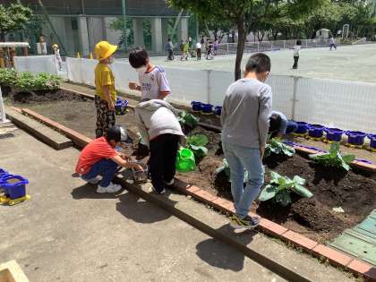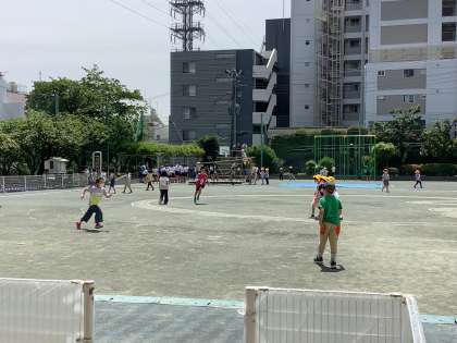 晴れた日はたくさんの子供たちが外に出ています。ボール遊びや鬼ごっこなどで体を動かしたり、花壇やビオトープでは虫の観察をしたりする姿が見られます。