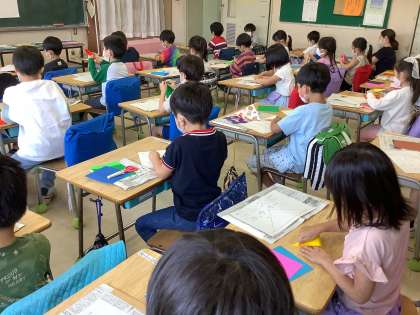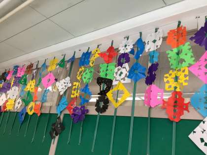 折り紙とハサミを使い、綺麗な飾りを作りました。折り紙を丁寧に折り、どんな形になるか想像しながら思い思いに折り紙に切り込みを入れていきました。出来上がった素敵な作品を、他の学年の子たちも楽しそうに鑑賞していました。