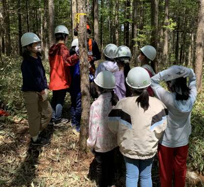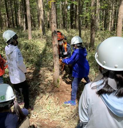 間伐2 公開日 2022/05/30 更新日 2022/05/30 今日のできごと チェーンソーを用いた間伐を見学し、いよいよ自分達。 グループで協力して、木を切り倒します。 全ての木が資源であること、活用することが大切だということを考えながら、、、 いいね(0)