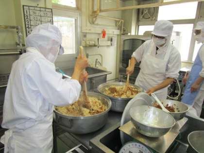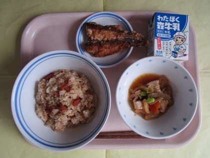今日は兵庫県の郷土料理です。兵庫県でよくとれるタコとハタハタを使ったかみかみメニューにしました。ハタハタはよく噛んで骨ごと食べましょう。「じゃぶ」とは、鶏肉、野菜、豆腐を煮込んだもので、人が集まる行事のときに振る舞われてきました。「じゃぶ」という料理名の由来は、煮込むとき、通常の煮物のように水を使わなくても、煮ているうちに豆腐や野菜から水分が出てじゃぶじゃぶすることから付いたといわれています。