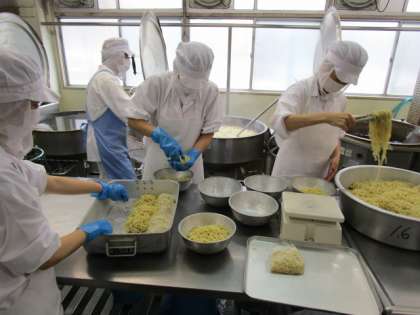 今日はみそ味のつけ麺です。このつけ麺は私が通っていた小学校の人気メニューで、今回中根小で再現してみました。スープは豚骨、鶏がら、かつお節をたくさん使ってだしをとりました。野菜や豚肉もたくさん入っていて栄養満点です。私の思い出の味を楽しんでください!