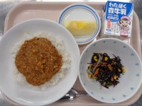 【1月9日(金)献立】・ドライカレー ・ひじきサラダ ・くだもの(りんご) ・牛乳にんにく(青森県) にんじん(北海道) たまねぎ(北海道) ピーマン(茨城県) しょうが(高知県)こまつな(埼玉県) ...