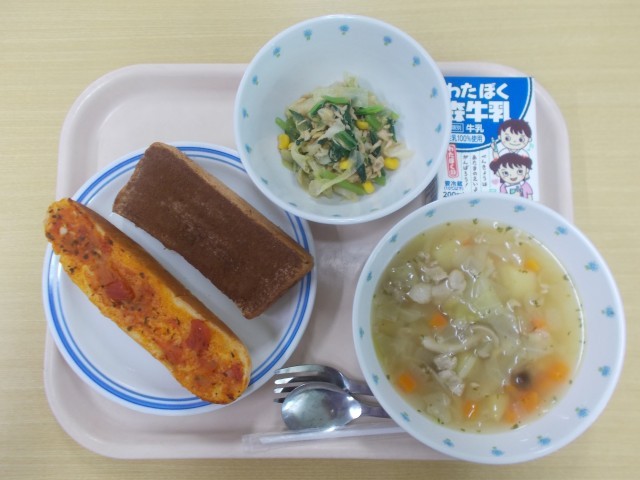 ティラミス風トースト(国産小麦の無塩パン) ひよこまめのスープ こまツナサラダ 牛乳