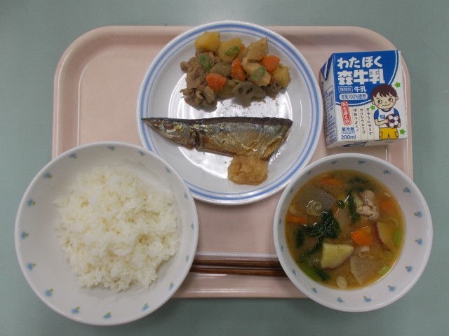 ごはん さつま汁 さんまの塩焼き たけのこいりちくぜんに 牛乳