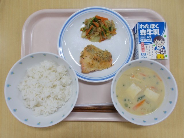ごはん 豆乳味噌汁 さけのさざれ焼き おかか和え 牛乳