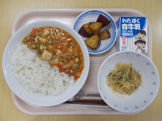 ご飯 西湖豆腐 もやし春雨サラダ 大学いも 牛乳