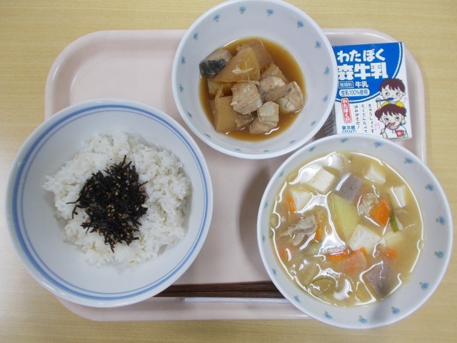 ごはん ひじきふりかけ 豚汁 ぶり大根 牛乳
