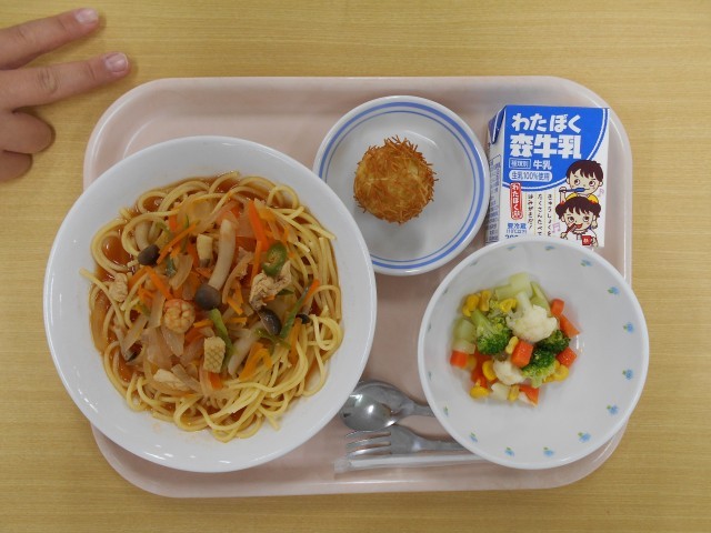 スープスパゲティ 花野菜のサラダ さつまいものいがぐり揚げ 牛乳