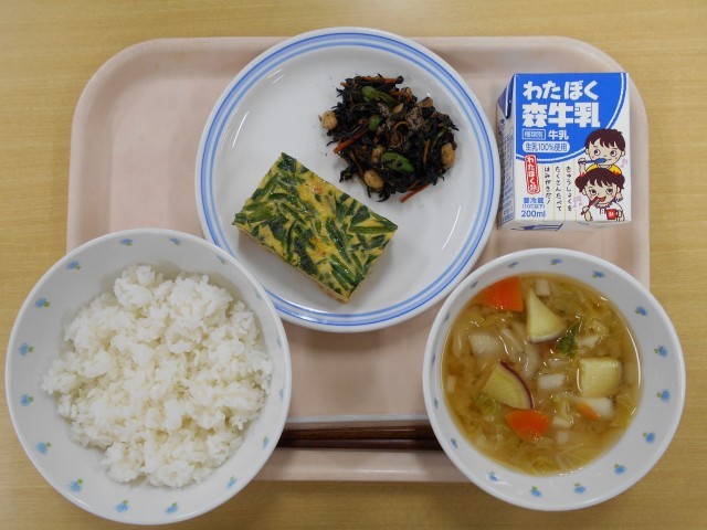 新米ごはん さつまいもの味噌汁 千草焼き 大豆とひじきの煮物 牛乳