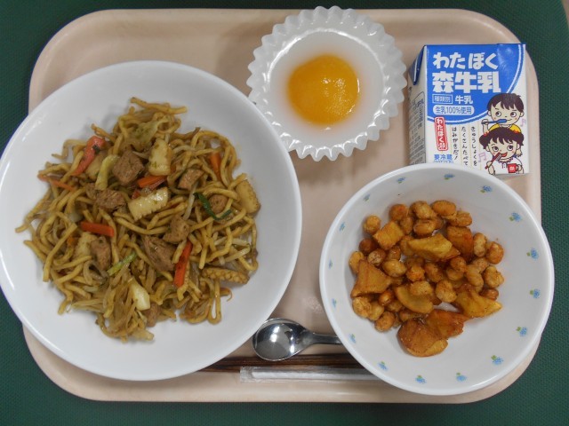 やきそば スパイシー大豆ポテト おかしな目玉焼き 牛乳